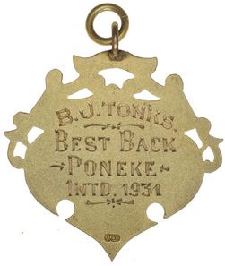 P.F.C. (Poneke Football Club), fob medal, handcrafted in gold (9ct, 3.3g, 30x30mm), reverse inscribed 'B.J.Tonks/Best Back/Poneke/Intd.1931'. Extremely fine.