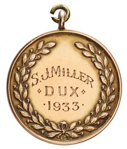 WAIMATE HIGH SCHOOL, Dux, 1933, struck in gold (9ct, 12.8g, 35x30mm), no maker, ring top suspension, inscribed 'S.J.Miller'. Extremely fine.