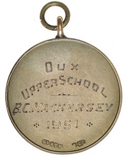 SCOTS COLLEGE (WELLINGTON), Dux medal, in gold (9ct, 8.1g, 26mm), by M&K Ld (Mayer & Kean, Wellington), ring top suspension, reverse inscribed 'Upper School/B.C.Mackersey/1951'. Very fine.