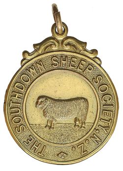 THE SOUTHDOWN SHEEP SOCIETY N.Z., struck in gold (9ct, 11.4g, 33x29mm), by M&K Ld (Mayer & Kean, Wellington), ring top suspension, reverse inscribed 'Manawatu Show 1947/Best Ram under 18 Months/(Open)/W.R.Oakley'. Extremely fine.