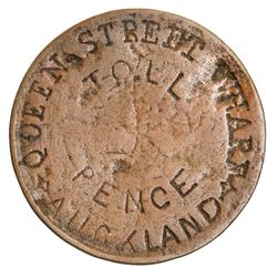 QUEEN STREET WHARF, Auckland, toll token, 6 Pence, incuse lettering, struck both sides in copper ...