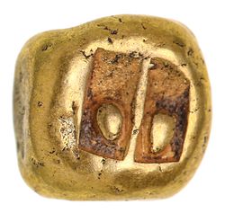 INDONESIA, Srivijaya Kingdom, (c.680-1250 A.D.), gold masa of twenty rattis (2.53 g) on square flan, obv. Devanagari 'Ta', rev. two rectangular incuses with pellet in lower part of each, (Mitchiner [South East Asia] 722-3). Very fine, rare.