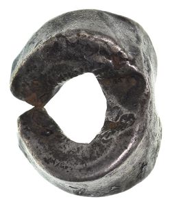 THAILAND, Lannathai Kingdom, (14-16th century), silver "Ka-Kim" Tamlung or silver bar split and folded back to join at ends (four baht), (60.93 g) with stamps of Chakra, Chiengmai, Chiengsen, on both sides and base, (Le May Pl.III,1). Very fine.