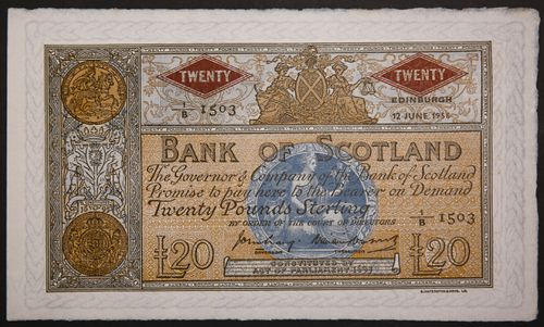 SCOTLAND, Bank of Scotland, twenty pounds, Edinburgh, 12 June 1956, 1/B 1503, (P.94e, SC.143a). Original ...