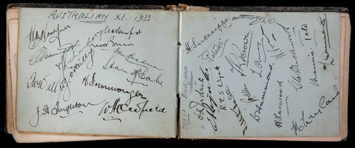 CRICKET EPHEMERA, ABC Sheffield Shield booklet, 1934-1935, "In Quest of Ashes", 1934 Don Bradman Souvenir Booklet published by Wrigleys; two autograph books, one wth the Australian XI 1933 signatures (12) and England 1932-3 (18); The famous "Body Line" test players; one book has Dec 30th 1960 shield teams NSW and Victoria. Fine - very fine. (4)