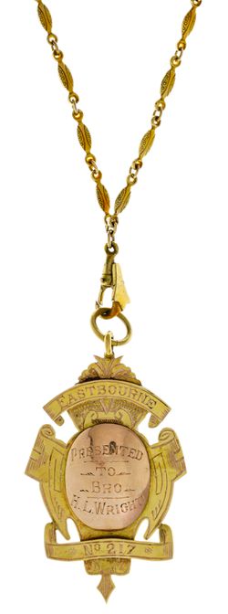 MASONIC GOLD FOB MEDAL, tested as 14ct gold (11.90g; 31x48.5mm), handcrafted for Eastbourne No 217 (Lodge, now defunct), on the central oval raised disc is inscribed, 'Presented/To/Bro./H.L.Wright', on the reverse is inscribed, 'S.W/1923-24' (S.W is Senior Warden), this fob is attached to a decorative neck chain (70cm long, 35cm when worn) stamped 'Amerikaner Metal' (gold plated). Very fine.