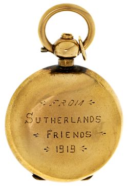 SUTHERLANDS, rolled gold sovereign case (30.5x14mm), by Dennison Watch Case Co (Birmingham), ring top suspension, inscribed on lid 'To/Cpl W.F.White/on his return/from the War', and on the reverse 'from/Sutherlands/Friends/1919'. Some handling marks, otherwise very fine.