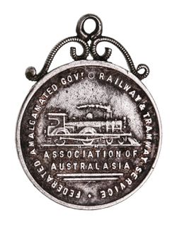 FEDERATED AMALGAMATED GOVT RAILWAY & TRAMWAY SERVICE ASSOCIATION OF AUSTRALASIA, undated, in silver (23mm) with scroll mount, obverse, locomotive facing right, reverse 'One Industry' below mount with the six state names radiating out from a lantern, 'One society' below. Very good.