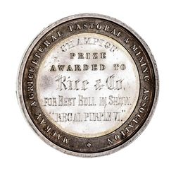 MACKAY AGRICULTURAL PASTORAL & MINING ASSOCIATION, in silver (38mm), by T.S. (T.Stokes), reverse inscribed, 'Champion'/(PRIZE/AWARDED TO)/ 'Rice & Co./For Best Bull in Show./"Regal Purple VI."; another in bronze (38mm), reverse inscribed, 'Rice & Co./for Pen of Fat Bullocks.' Hairlines, otherwise very fine. (2)