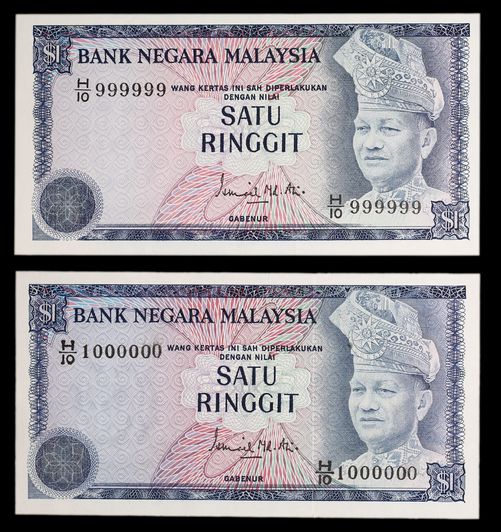 MALAYSIA, Federation, Bank Negara Malaysia, (1967-72) series, one ringgit prefixes A/49, 63; B/96; C/99; D/1 and Z/1 (replacement note) (P.1) (6); five ringgit A/20 (P.2); ten ringgit B/1, B/71, Z/1 (very fine) (P.3) (3); 1972-76 series (P.7) (2), P.8a (2, including Z/1 replacement note), P.9a (6, including Z/1, Z/2, Z/3 replacement notes)); fifty ringgit (P.10a) (3, including Z/1 replacement note), (P.16) (2, including Z/1 replacement note), (P.13a) (6, including Z/1 replacement note and H/10 one million number note), (P.13b) (2), (P.14a, b), (P.15a) (2, including Z/1 replacement note); 1981-83 series (P.19 prefix set AA to AX (21)), (P.19 (2), 19A (2) first 19 is BQ1000000 (million number note)), (P.20) (5), (P.21) (2), (P.22), (P.23). Except the ninth very fine, rest uncirculated. (71)