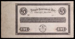 TONGA, Tongan Government Note, Friendly Islands, unissued printers proof of five dollars 18(65) by Robert Downing Sydney NSW, back has legend in Tongan 5 NIMA in thin paper. Nearly uncirculated and extremely rare, unrecorded.