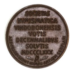 AUSTRIA, Joseph Eckhel, numismatist, (1737-1798), AE medal, (35mm, 26.81 g), Vienna Numismatic Society, by A. Scharff, dated 1880, obv. draped bust left, in incuse to left, signature of Joseph Eckhel, rev. SOCIETAS / NVMISMATICA / VINDOBONENSIS / VOTIS / DECENNALIBVS / SOLVTIS / MDCCCLXXX over small owl standing right between branches, below, AES PRAEBVERVNT NVMMI ANTIQVI CONFLATI. Even brown surfaces, extremely fine and scarce.