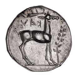 ITALY, Bruttium, Kaulonia, (c.475-425 B.C.), silver nomos 20mm, (8.12 g), obv. Apollo advancing right, holding branch aloft in right hand, small daimon running right on extended left arm, retrograde KAV**L* to left, to right, stag standing right, head reverted, rev. stag standing right, retrograde KAV above, laurel branch to right, (S.462, Noe, Caulonia, Group F, 83 [same dies], HN Italy 2046, SNG ANS 176, SNG Lloyd 575, Dewing 489, Hermitage Sale II 166 [same dies]. Extremely fine, lightly toned, exceptional for issue.