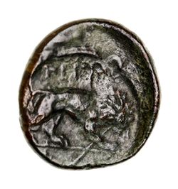 MACEDON, Kingdom of, Perdikkas III, (365-359 B.C.), AE 16, tetrachalkon, (3.33 g), Aigai Mint, obv. head of Herakles in lion skin to right, rev. lion standing right, breaking a javelin with its jaws, above **PERDIK*, (S.1515, Westermark, Kraay-Morkholm Essay, Remarks 47, SNG ANS 114, BMC 3, HGC 3, 839 [R]). Dark patination, obverse double struck, nearly very fine/good very fine and rare.