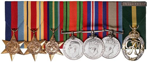 GROUP OF SEVEN: 1939-45 Star; Africa Star; Pacific Star; Defence Medal 1939-45; War Medal 1939-45; Australia Service Medal 1939-45; Efficiency Decoration (GRI) with Australia suspender. NX12237 Lt. Col. E.H. Evans A.I.F. on first four medals, NX12237 E.H.Evans on fifth and sixth medals, NX12237 Lt.Col.Evans. E.H. on last medal. The fifth and sixth medals impressed, the others engraved. Display court mounted, contact marks, otherwise nearly very fine.
