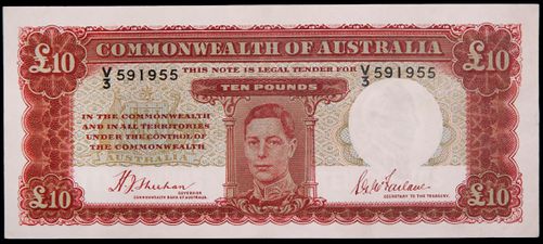 TEN POUNDS, Sheehan/McFarlane (1940), V/3 591955 (R.58F), first serial prefix. Virtually uncirculated and rare thus. ...