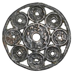 CHINA, openwork charms, 19th century or earlier issues, various sizes mostly 55-62 mm (14), few smaller from 32mm (8); types include Scott Semans (Compendium of Chinese Amulets Part 1 ; Openworks) include numbers 95, 161c, 180a, 275, 276, 312, 331, 343 (2), 345 (2), 347, 354, 363 (Illustrated) [type of 8 coins around central coin], 494, others and several provences noted on backing sheets. Mostly fine - very fine, nice representative collection. (22)