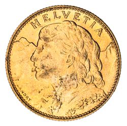 SWITZERLAND, twenty francs, 1935B (KM.35.1). Nearly uncirculated.