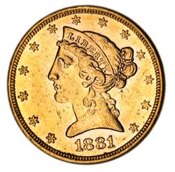 USA, FIVE DOLLARS OR HALF EAGLE, 1881S, Liberty head. Surface marks, otherwise good extremely fine. ...
