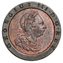 GEORGE III, pattern halfpenny, 1788, by J.P.Droz at the Soho Mint, struck off centre and ...