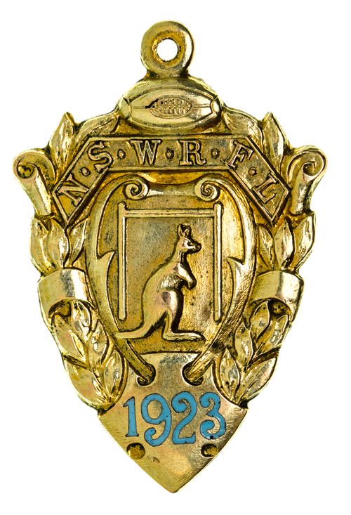 N.S.W Rugby Football League 1923, prize fob in enamel and gold (9ct; 6.51g; 24x31mm), by ...