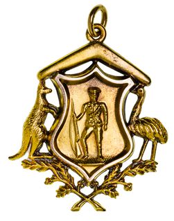 RETURN FOB, in voided gold (15ct; 9.31g; 32x35mm), by WD (W.Drummond), ring top suspension, reverse inscribed, 'Presented/To/Pte A.Tomlinson/by the residents/of Darlimurla/25.4.19'. Some toning extremely fine.