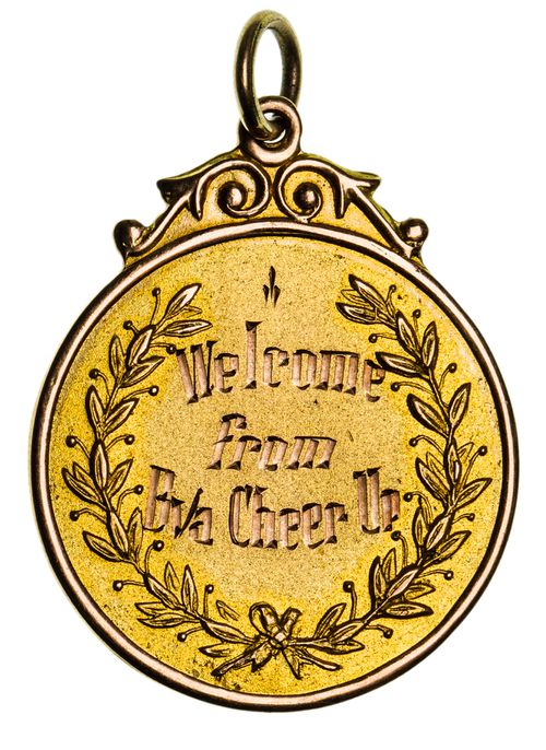 RETURN FOB, in gold (9ct; 5.33g; 25mm), scroll and ring top suspension, obverse inscribed, 'Welcome/From/Bva Cheer Up', reverse inscribed, 'Tpr. L.Warner'. Good very fine.