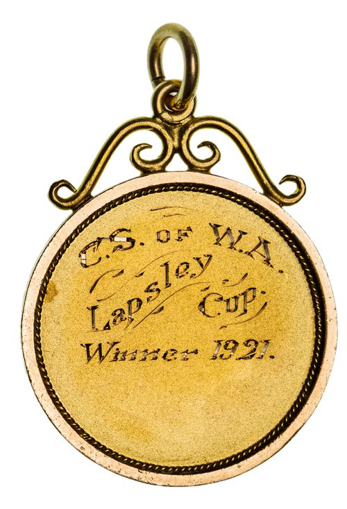 CLAREMONT SWIMMING (CARNIVAL) OF WESTERN AUSTRALIA, prize medal in gold (15ct; 6.90g; 26mm), by Levinson, scroll and ring top suspension, obverse inscribed, 'C.S. of W.A./Lapsley/Cup./Winner 1921.'. Extremely fine.