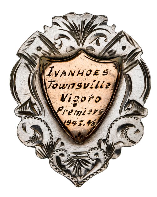 TOWNSVILLE IVANHOES, badge in sterling silver with gold centre shield (27.5x35mm), pin-back, gold shield inscribed, 'Ivanhoes/Townsville/Vigaro/Premiers/1945-46', unnamed. Very fine.