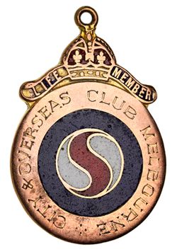 CITY & OVERSEAS CLUB MELBOURNE, Life Member fob in enamel and gold (9ct; 6.24g; 22.5x30mm), by K.G.Luke, ring top suspension, reverse inscribed, 'E.A.Murrell/1949'. Fine.