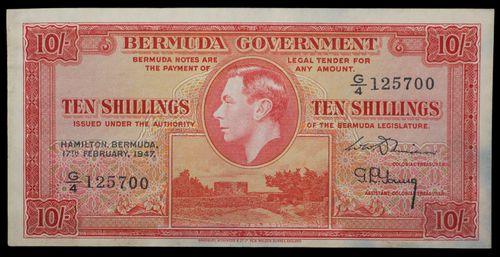 BERMUDA, British Administration, Bermuda Government, George VI, 1947 issue, ten shillings, Hamilton, 17th February, 1947, G/4 125700 (P.15). Good very fine.