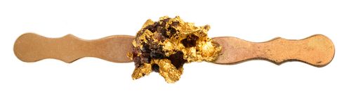 GOLD NUGGET BROOCH, in gold (9ct; 4.16g; 42x8mm), by Apex, features decoratively shaped single bar and in the centre is a genuine gold nugget, pin-back, with unofficial box. Very fine.