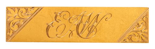 OBLONG SHAPED BROOCH, c1885, in gold (15ct; 9.62g; 60x15mm), by Stevenson (Bros), pin-back, inscribed on obverse, 'EAW' and with decorative engraving at each end. Hairlines, otherwise good very fine.