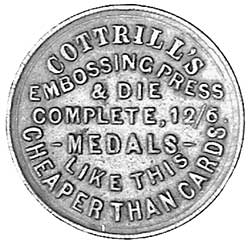 BIRMINGHAM, Warwickshire; Blackham Bros. (BWS 300) (2), Edwin Cottrill (BWS 350 in brass, edge milled), E. Cottrill (BWS 360 (2, one double struck) (illustrated), J. Gargory (BWS 380 in gilt brass) (BWS 400 in gilt brass, pierced, 2, one with rounded plain edge, 24mm) (illustrated) (BWS 410 in gilt brass, pierced) (illustrated). Fine-extremely fine. (9)
