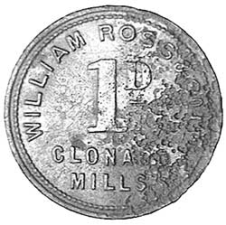 CO. ANTRIM, Belfast, William Ross & Co. Ltd, Clonard Mills truck ticket for one penny (this value unrecorded, others see N.S.I. Occ papers 8) and halfpenny. The first corroded on right side otherwise good fine and extremely rare if not unique, the second very fine and very rare. (2)