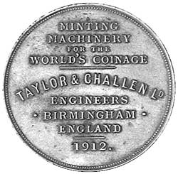 TAYLOR & CHALLEN LD., Birmingham/Minting Machinery for the World's Coinage 1912, in brass (38mm), another ...