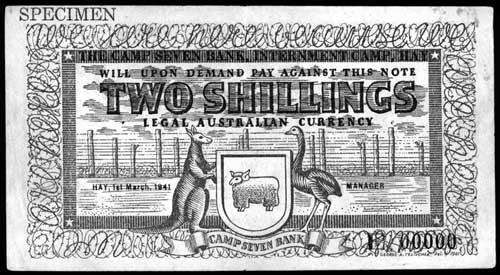 WORLD WAR II, The Camp Seven Bank, Internment Camp, Hay, two shillings, 1st March 1941 ...