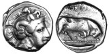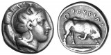 ITALY, Lucania, Thurium (Thourioi), (350 -300 B.C.), silver stater, (7.4 grams), obv. head of Athena to right wearing crested Athenian helmet, ornamented with figure of ...