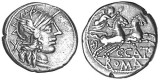 Q. MINUCIUS RUFUS, (c.122 B.C.), silver denarius (3.872 grams), obv. Roma helmeted head to right, X below chin, [R]V[F] behind, rev. Dioscuri to right, Q. ...