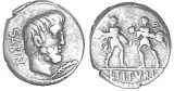 M. LUCILIUS RUFUS, (101 B.C.), silver denarius, Rome mint, (3.858 grams), obv. Head of Roma, to right within laurel wreath, PV behind, rev. Victory in ...