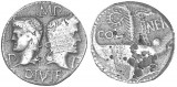 AUGUSTUS, (27 B.C. - A.D. 14), silver denarius, Lyons mint, issued 15-13 B.C. (3.650 grams), obv. bare head of Augustus to right, around AVGVSTVS DIVI ...