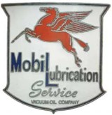 MOBIL LUBRICATION SERVICE, shield shaped, red white and blue enamelled hard white metal attendant's hat badge, shield on back Vacuum Oil Co Aust/Laughtons Enamel Works ...