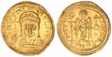 JUSTINIAN I, (527-565), gold solidus, issue of 545-565, Constantinople mint, (3.882 grams), obv. helmeted and cuirassed bust facing, holding globe on cross and shield, around ...