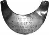 ABORIGINAL KING PLATE OR GORGET, c.1900s, inscribed to 'Peter / Chief of / Warangesda / Mission', crescent shaped brass (150 x 220mm), holed at each ...