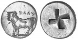 BITHYNIA, Kalchedon, (c.340-320 B.C.), silver siglos (Persian standard), (5.424 grams), obv. bull standing to left, on corn-ear, above **KALC* rev. quadripartite incuse square of mill-sail ...