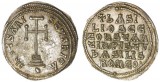 BASIL I, (A.D. 867-886), silver miliaresion, Constantinople mint, (2.838 grams), obv. cross potent on three steps, globe beneath, IhSUS XRI STUS NICA around, rev. six ...
