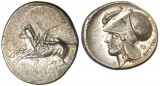 CORINTHIA, Corinth, (345-307 B.C.), silver stater, (8.166 grams), obv. Pegasos flying to left, Q below, rev. head of Athena to left, wearing Corinthian helmet, below ...