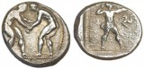 PAMPHYLIA, Aspendos, (370-330 B.C.), silver stater, (10.780 grams), obv. two naked athletes as wrestlers grasping each other by the hands, KI between, rev. slinger advancing ...