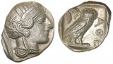 ATTICA, Athens, (449-413 B.C.), silver tetradrachm, (17.116 grams), obv. head of Athena to right wearing ivy crested helmet, eye in profile, rev. owl standing to ...
