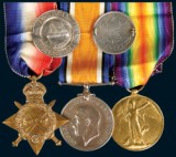 TRIO: 1914-15 Star; British War Medal 1914-18; Victory Medal 1914-19. 907 Pte E.L.C. Young. 1/A.N.& M.E.F. on first medal, 907 ER/CPL. E.L.C.Young. 1/A.N.& M.E.F. on ...